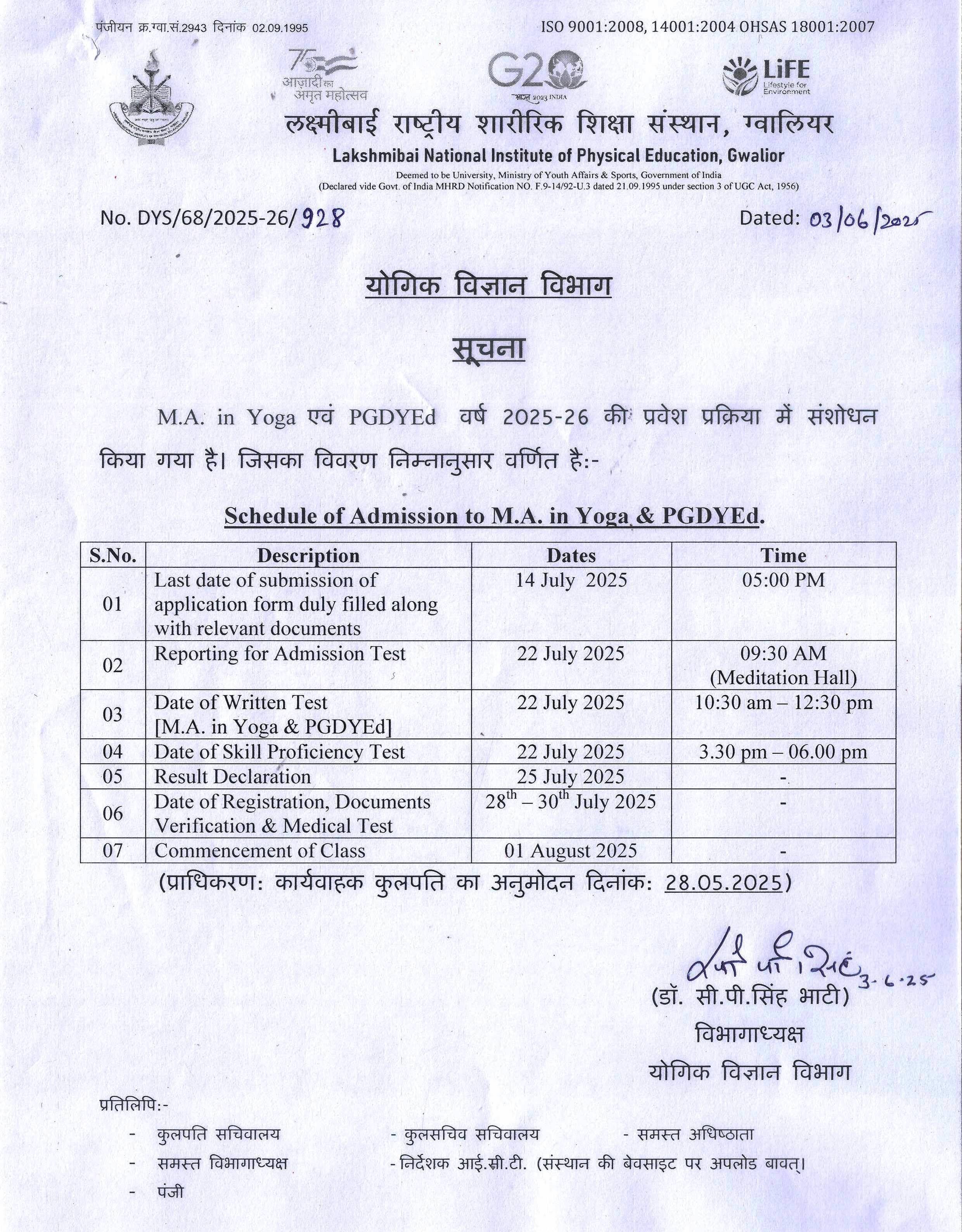 NOTICE REGARDING EXTENDED SCHEDULE for admission M.A. (YOGA) & P.G.D.Y.Ed. dated 04-Aug-2025 Pdf